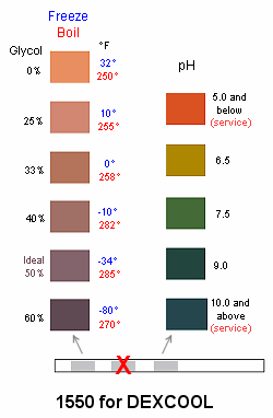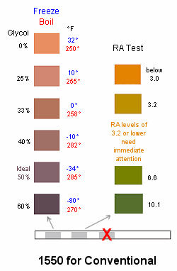 Glycol mixture? The results will be less than 1 color block conservative. Ethylene Glycol provides slightly higher freeze protection at like concentrations, and therefore contributes to a lower freeze point protection. Differences of less than 1 color block will result. |